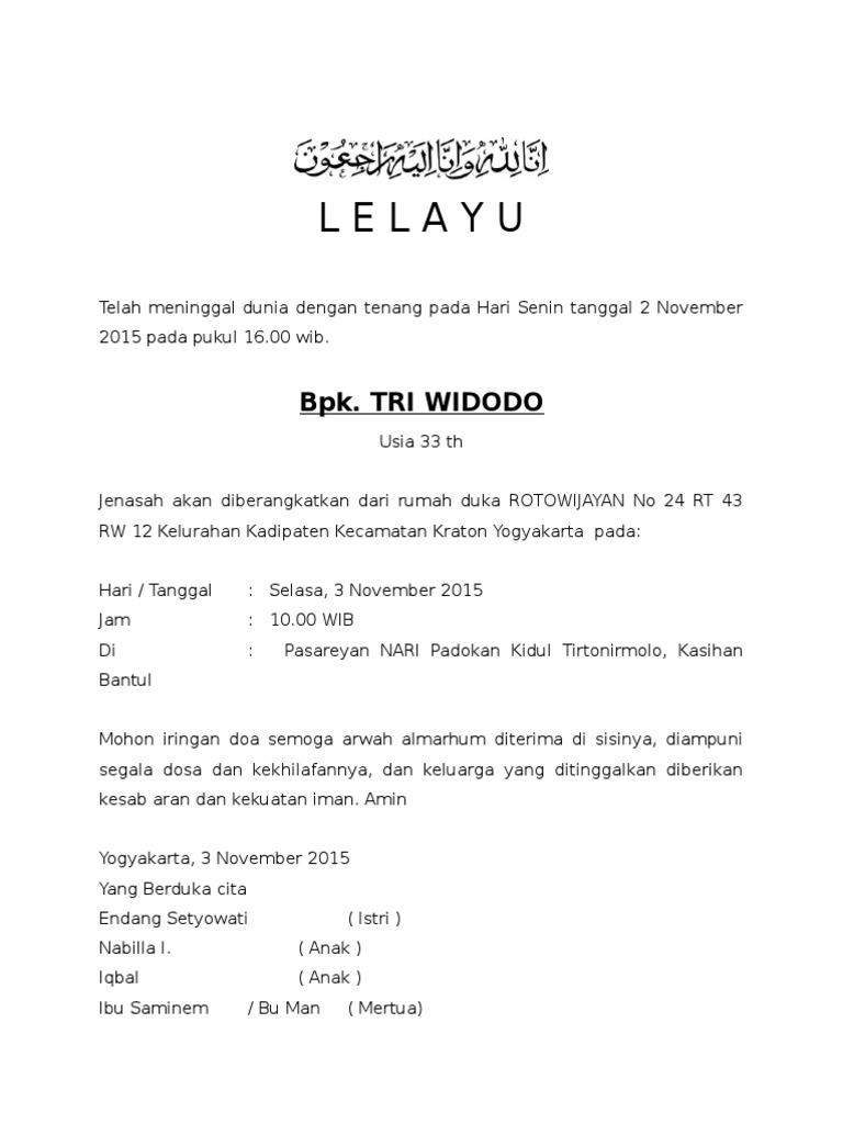 4 manfaat atau fungsi dan tujuan pembuatan surat izin. Hazna grafika surat lelayu bahasa jawa format 1155 x 1600 contoh surat berita lelayu bahasa jawa pawartos lelayu format 536 x 350 pixel download contoh surat edaran dengan penulisan yang baik dan benar format 352 x 479 pixel download berita lelayu bahasa jawa doc gue viral format 1009 x 1600 pixel download. Artikel (59) event (21) profil (12. 27 contoh surat izin tidak masuk kerja lengkap yang baik dan. Kegiatan pkl atau magang yang harus kamu jalani setiap hari bisa saja tidak berjalan mulus. 15 contoh surat izin tidak masuk kerja karena. Untuk mendapatkan data primer, tentunya kau mesti melalui progres wawancara dengan narasumber. Contoh layang lelayu bahasa jawa sebagai referensi. Surat dibagi bagi menjadi banyak jenis sesuai peruntukkannya. Pengumuman penyelesaian urusan dunia utang piutang ataupun yang lain dengan almarhum untuk diselesaikan dengan para ahli waris. Contoh surat izin sakit dalam bahasa jawa. Ada banyak aktivitas yang sah dilakukan hanya jika sudah mendapatkan izin dari pihak berwenang. Contoh surat izin sakit ini bisa kamu gunakan untuk keperluan tidak masuk sekolah, kuliah, atau pun kerja.